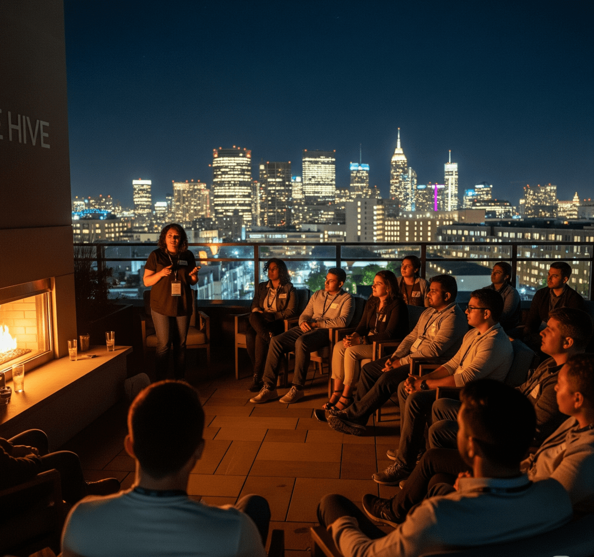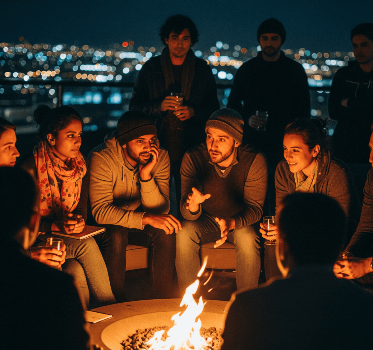 Join our monthly rooftop fireside to soak up lessons, share laughs, and swap stories over mocktails.