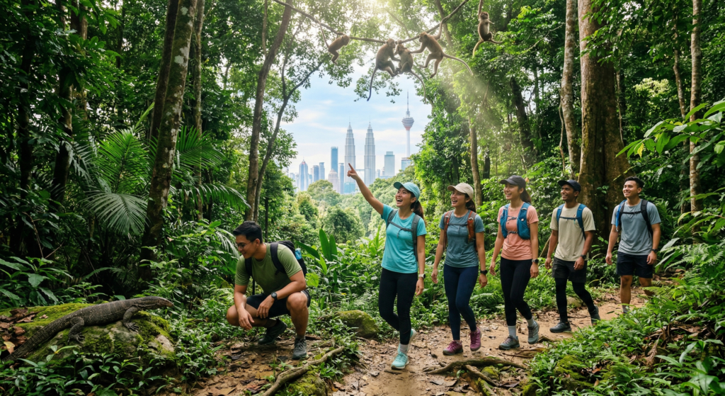 A group of friends ventures into the lush urban jungle trails just outside Kuala Lumpur, where the rainforest meets the city skyline.