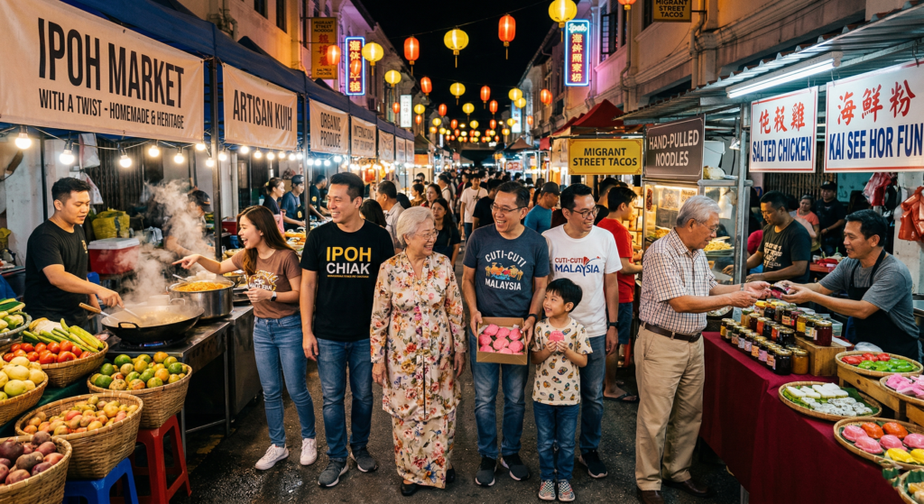 The vibrant streets of Ipoh’s local food market come alive at night, where the scent of lemongrass and charcoal fills the air and authentic Malaysian life unfolds.